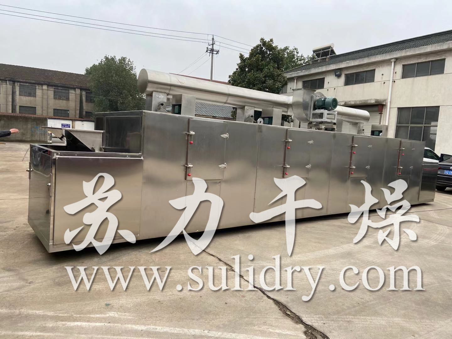 物料由加料器均匀地铺在网带上,网带一般采用12-60目不锈钢丝网,由传动装置拖动在干燥机内移动。干燥机由若干单元组成,每一单元热风独立循环,部分尾气由专门排湿风机排出,废气由调节阀控制,热气由下往上或由上往下穿过铺满物料的网带完成热量与质量传递的进程,带走物料水份。网带缓慢移动,运行速度可根据物料温度自由调节,干燥后的成品连续落入收料器中。上下循环单元根据用户需要可灵活配备,单元数量亦可根据需要选取。