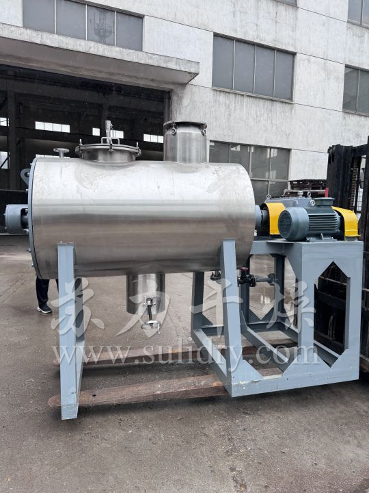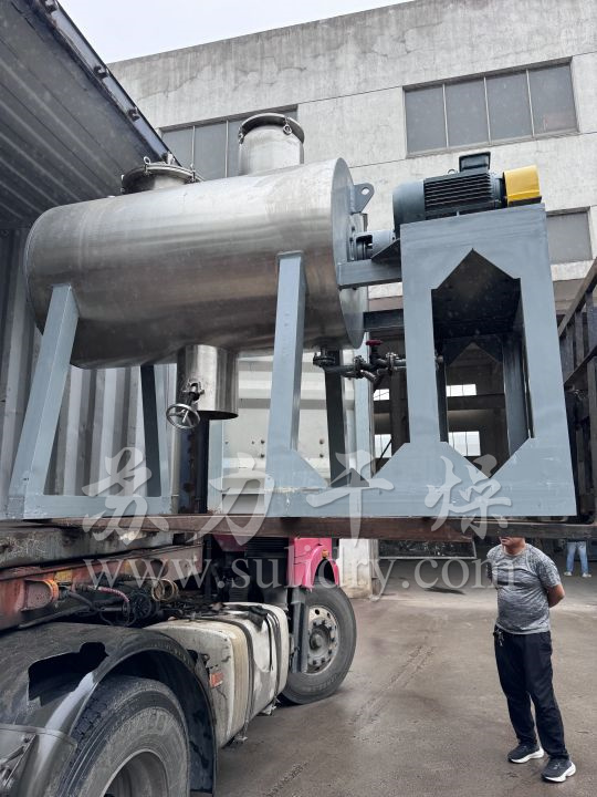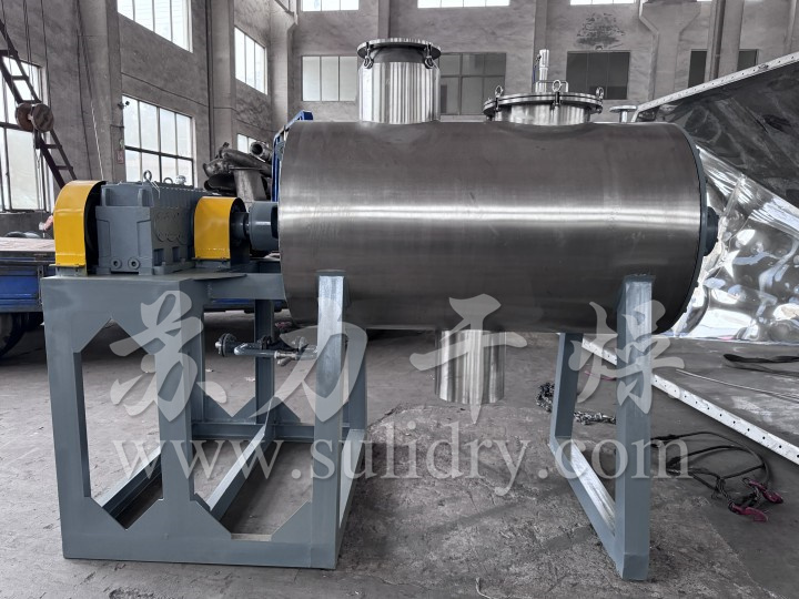 本机是一种新颖卧式间歇式真空干燥设备,湿物料经传导蒸发,带有刮板搅拌器不断清除热面上的物料,并在容器内推移形成循环流,水份蒸发后由真空泵抽出。