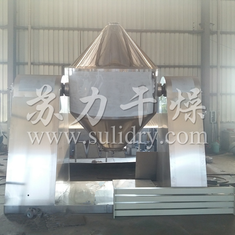 双锥回转真空干燥机是在密闭的夹层中通入热能源(如热水,低压蒸汽或导热油),热量经内壳传给被干燥物料。物料处于真空状态,蒸汽压下降使物料表面的水份(溶剂)达到饱和状态而蒸发了,并由真空泵及时排出回收。物料内部的水份(溶剂)不断地向表面渗透、蒸发、排出三个过程不断进行,物料在很短时间内达到干燥目的。