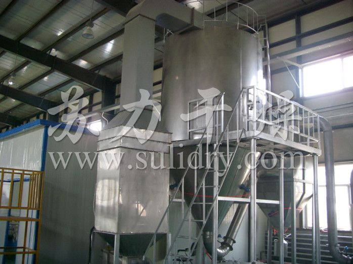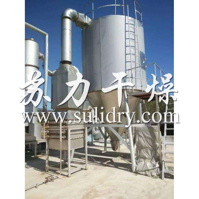 空气经过滤和加热,进入干燥器顶部空气分配器,热空气呈螺旋状均匀地进入干燥室。料液经塔体顶部的高速离心雾化器,(旋转)喷雾成极细微的雾状液珠,与热空气并流接触在极短的时间内可干燥为成品。成品连续地由干燥塔底部和旋风分离器中输出,废气由风机排空。