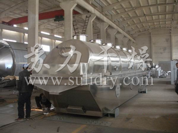 物料自进料进口进入机内,在振动力作用下,物料沿水平面流化床抛掷,向前连续运动,热风向上穿过流化床同湿物料换热后,湿空气经旋风分离器除尘后由排风1:3排出.干燥物料由排料进口排出。