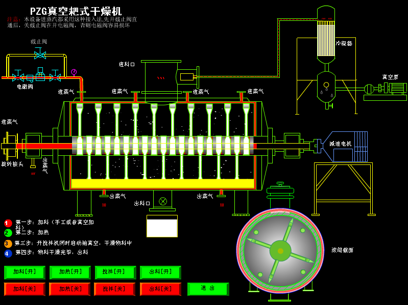 本机是一种新颖卧式间歇式真空干燥设备,湿物料经传导蒸发,带有刮板搅拌器不断清除热面上的物料,并在容器内推移形成循环流,水份蒸发后由真空泵抽出。