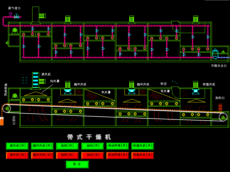 物料由加料器均匀地铺在网带上,网带一般采用12-60目不锈钢丝网,由传动装置拖动在干燥机内移动。干燥机由若干单元组成,每一单元热风独立循环,部分尾气由专门排湿风机排出,废气由调节阀控制,热气由下往上或由上往下穿过铺满物料的网带完成热量与质量传递的进程,带走物料水份。网带缓慢移动,运行速度可根据物料温度自由调节,干燥后的成品连续落入收料器中。上下循环单元根据用户需要可灵活配备,单元数量亦可根据需要选取。
