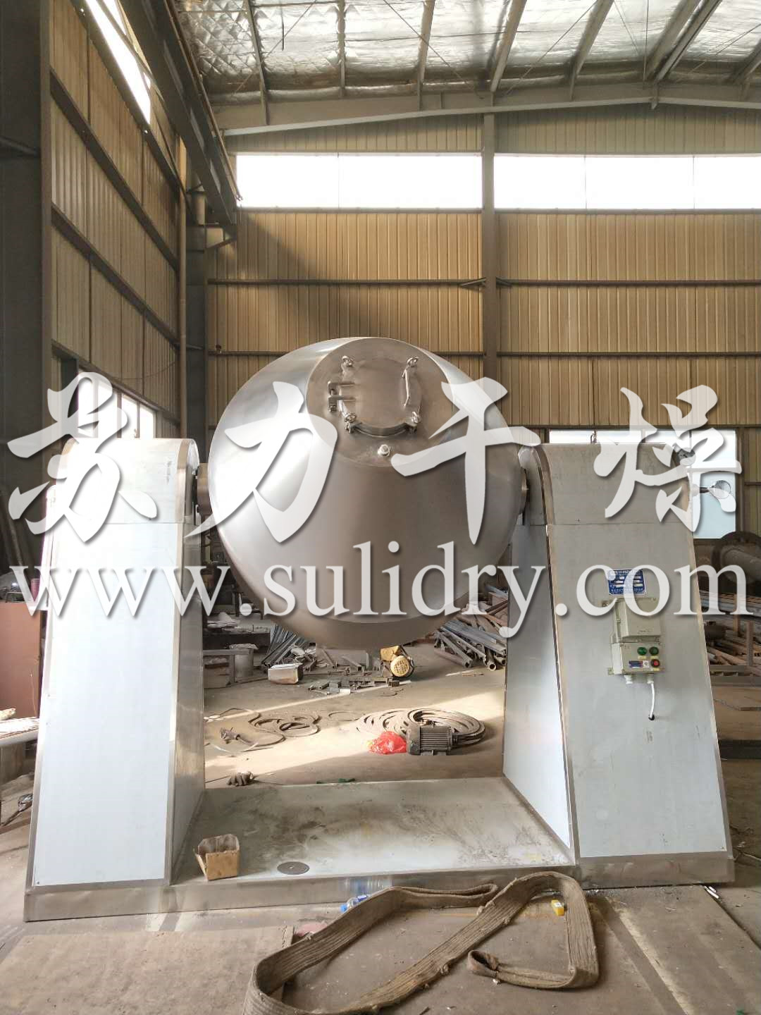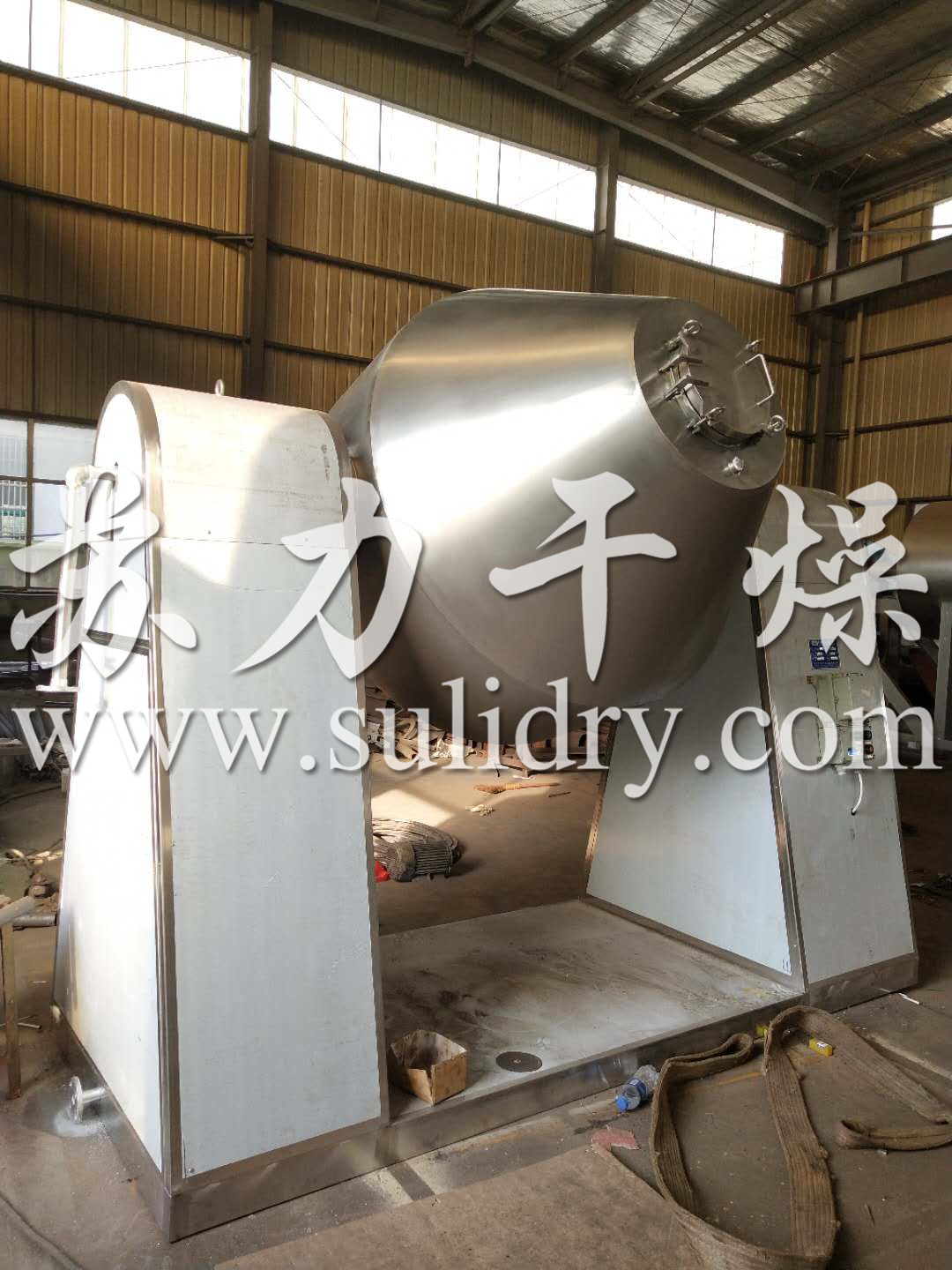 双锥回转真空干燥机为双锥形的回转罐体,罐内在真空状态下,向夹套内通入蒸汽或热水进行加热,热量通过罐体内壁与湿物料接触,湿物料吸热后蒸发的水汽,通过真空泵经真空排气管被抽走。由于罐体内处于真空状态,且罐体的回转使物料不断的上下内外翻动,故加快了物料的干燥速度,提高干燥效率,达到均匀干燥的目的。