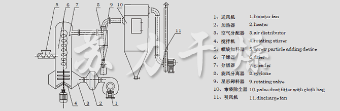 ⑤设备结构紧凑,占地面积小,集干燥、粉碎、分级为一体,是旋流技术、流化技术、喷动技术及对流技术的有机结合,干燥后不需要再粉碎、筛分,简化了生产工艺,节省了动力和设备费用。