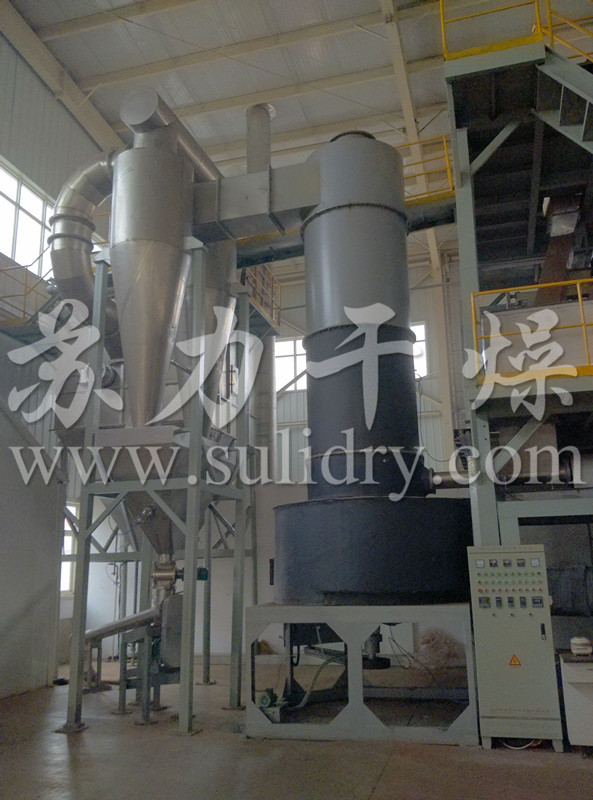 热空气切线进入干燥器底部,在搅拌器带动下形成强有力的旋转风场。膏状物料由螺旋加料器进入干燥器内,在高速旋转搅拌桨的强烈作用下,物料受撞击、磨擦及剪切力的作用下得到分散,块状物料迅速粉碎,与热空气充分接触、受热、干燥。脱水后的干物料随热气流上升,分级环将大颗粒截留,小颗粒从环中心排出干燥器外,由旋风分离器和除尘器回收,未干透或大块物料受离心力作用甩向器壁,重新落到底部被粉碎干燥。
