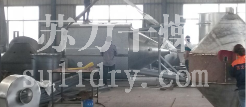 空气经过滤和加热,进入干燥器顶部空气分配器,热空气呈螺旋状均匀地进入干燥室。料液经塔体顶部的高速离心雾化器,(旋转)喷雾成极细微的雾状液珠,与热空气并流接触在极短的时间内可干燥为成品。成品连续地由干燥塔底部和旋风分离器中输出,废气由风机排空。